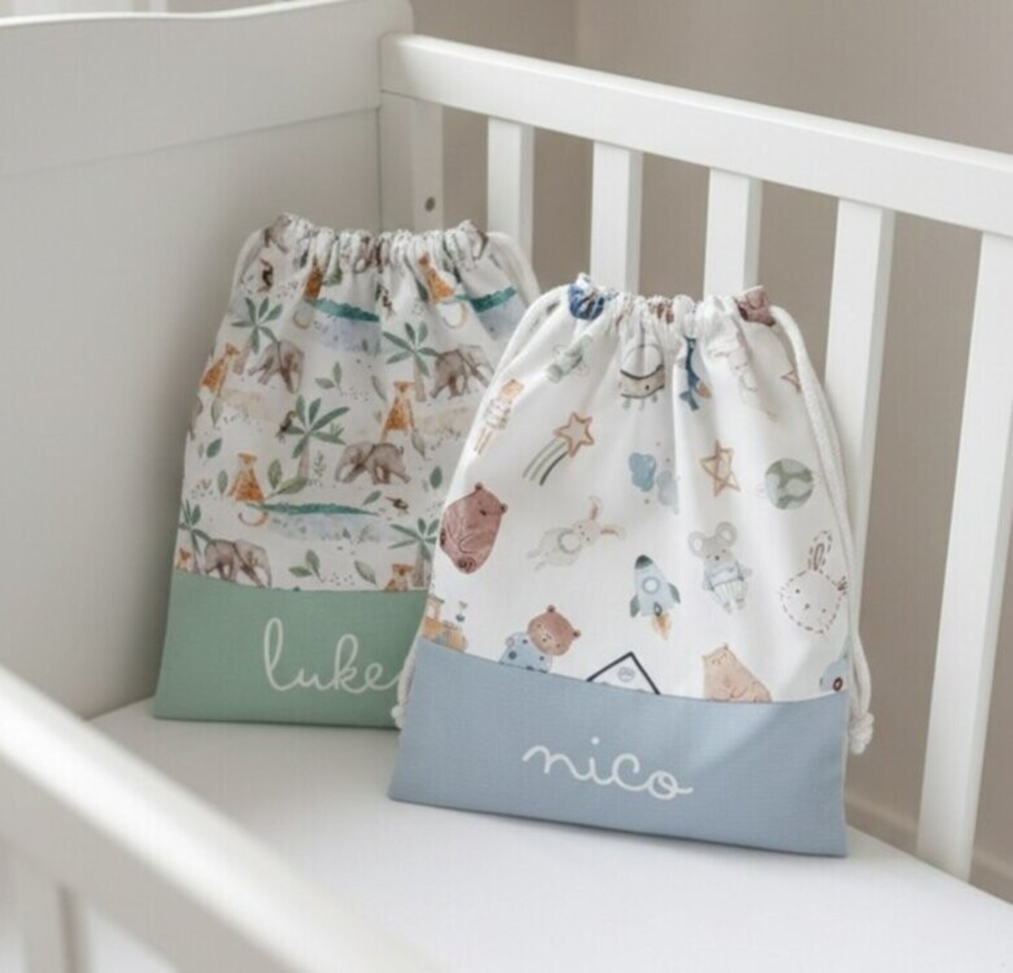 Preciosas cositas para canastillas de bebé ideales para regalar a futuros papás. Bodies y gorritos personalizados con el nombre, baberos, portadocumentos, portapañales y portatoallitas, bolsas de muda y muchas cosas más.